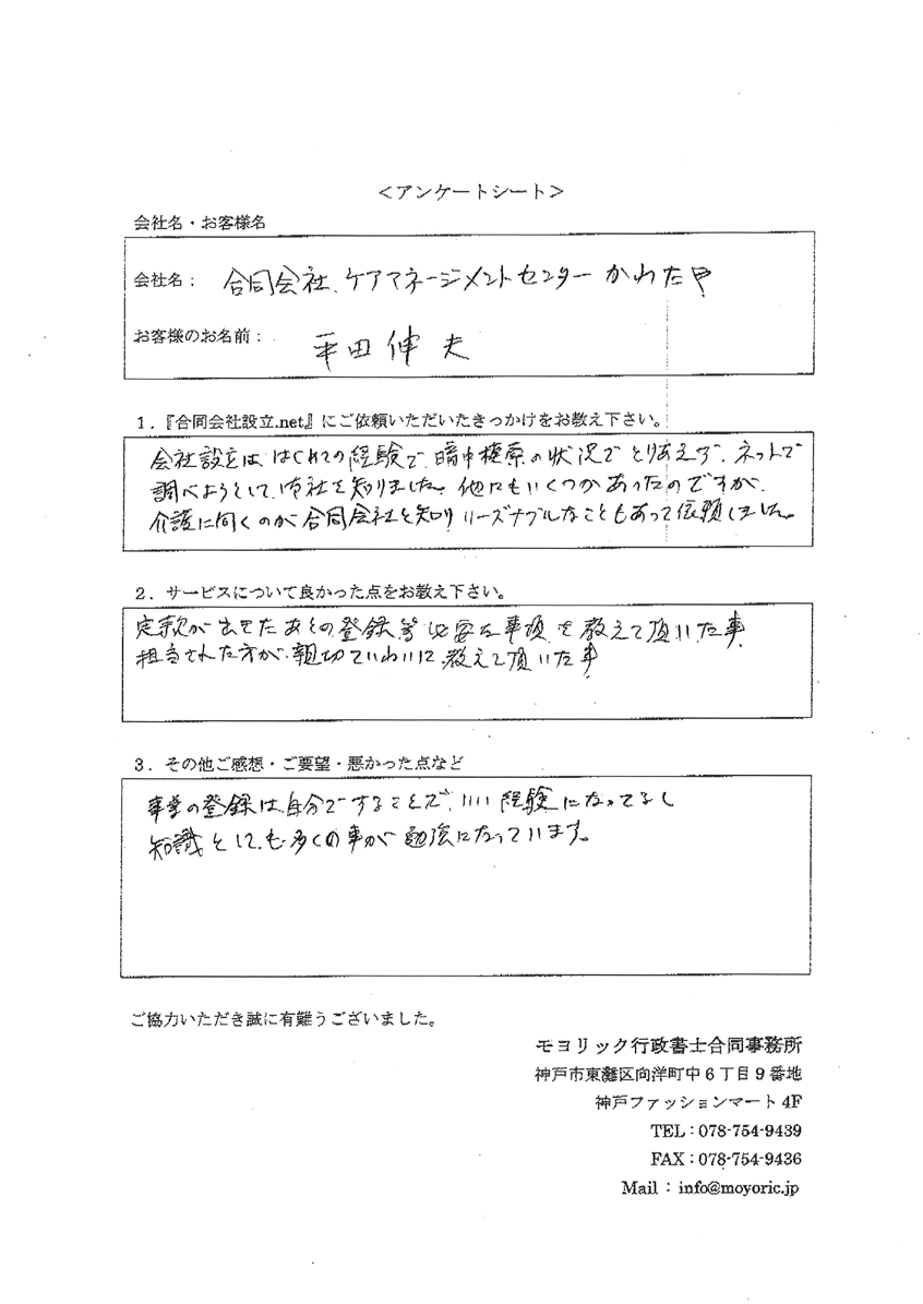 合同会社ケアマネージメントセンターかわたや 様 (設立年月:平成24年6月)