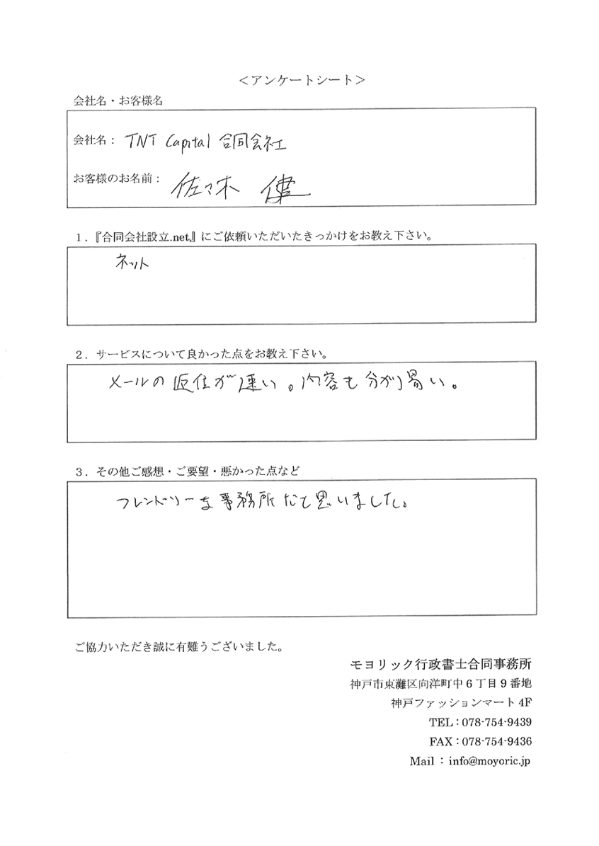 TNT Capital 合同会社 様 代表社員:佐々木 健 様